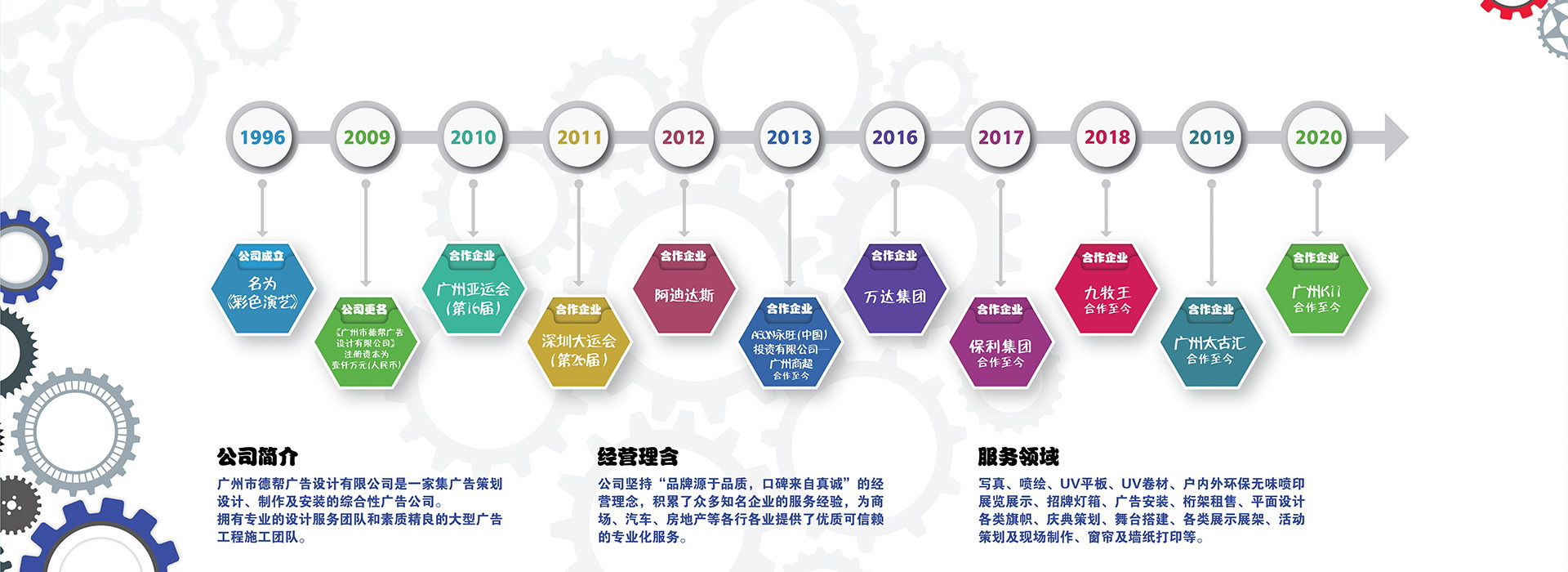 廣州市德幫廣告設(shè)計有限公司,是一家集廣告策劃 、設(shè)計及制作安裝于一體的綜合性廣告服務(wù)商,公司(原彩色演藝噴繪)成立于1996年,公司擁有惠普、愛普生戶內(nèi)外寫真噴繪機(jī)20臺,HP latex環(huán)保乳膠墨水打印機(jī)2臺,大噴機(jī)10臺,UV平板卷材機(jī)6臺,全自動智能切割機(jī)4臺等高端設(shè)備,專業(yè)的設(shè)計制作團(tuán)隊和素質(zhì)精良的大型廣告工程施工團(tuán)隊,廠房面積達(dá)3000平米。公司主要經(jīng)營戶內(nèi)、外寫真、噴繪、廣告工程的制作、平面設(shè)計、燈箱、招牌等業(yè)務(wù),公司所有的設(shè)備采用進(jìn)口設(shè)備、后期制作自動化,生產(chǎn)速度快、質(zhì)量第一。與方圓地產(chǎn)、萬達(dá)廣場、招商地產(chǎn)、萬科地產(chǎn)合作,主要制作內(nèi)容:廣告活動物料、圍墻的生產(chǎn)、安裝、桁架的搭建、活動執(zhí)行、高空安裝、燈旗的制作及安裝等業(yè)務(wù)。公司先后榮獲廣州地區(qū)十佳廣告工程制作公司、中國商務(wù)廣告協(xié)會廣告工程分會會員單位、全國噴繪企業(yè)入圍品牌公司等諸多榮譽(yù)。至今已發(fā)展成為華南地區(qū)大型的廣告產(chǎn)品供應(yīng)基地。并以“產(chǎn)量高、質(zhì)量好、交貨快”的經(jīng)營模式贏得了廣大客戶的稱贊。并堅持“品牌源于品質(zhì),口碑來自真誠”的經(jīng)營理念,積累了眾多知名企業(yè)、政府機(jī)構(gòu)的服務(wù)經(jīng)驗(yàn),為大型活動、商場超市、汽車、房地產(chǎn)等各行業(yè)提供了優(yōu)質(zhì)可靠的專業(yè)化廣告服務(wù)。旨在協(xié)助客戶提升品牌形象,并以建立長期品牌價值為使命,讓各行業(yè)的品牌形象結(jié)合產(chǎn)品推向市場,贏得足夠的社會關(guān)注,幫助企業(yè)品牌成長。